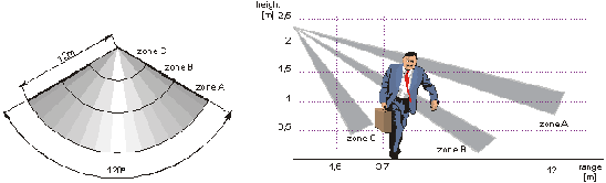 | 1、从图中的探测器的阴影区为一个探测区域,这样只有穿越探测区域时才会触发探测器,所以测试时,只有横切(穿越)探测区,探测器才会报警,否则,就会误认为该探测器的灵敏度低,结果擅自调高灵敏度,导致探测器频频误报。